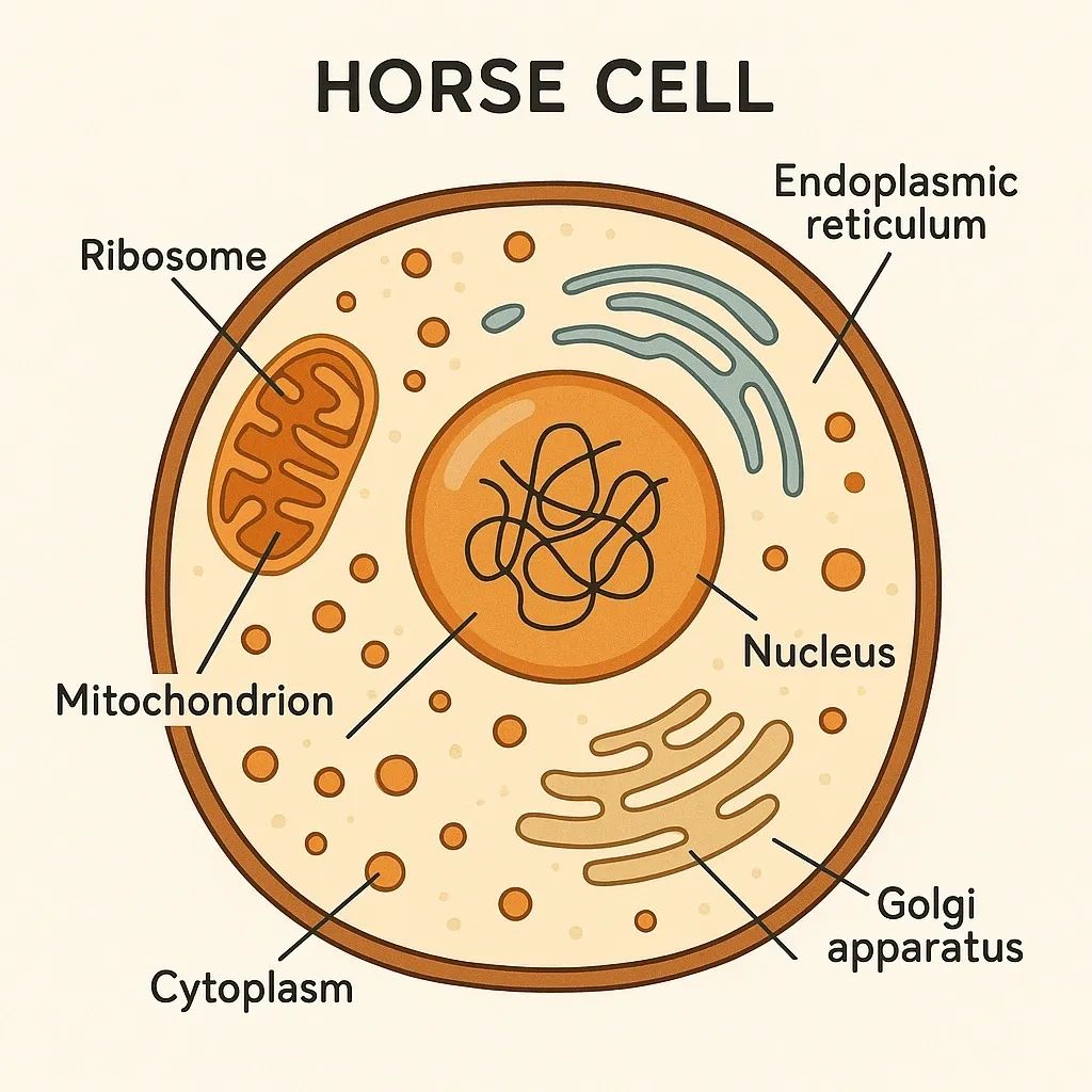 Cells are the basic building blocks of life. Every part of a horse’s body—muscles, bones, organs, skin, blood—is made up of cells. Each cell is surrounded by a membrane, contains genetic material (DNA), and has specialized structures (organelles) that perform key functions.