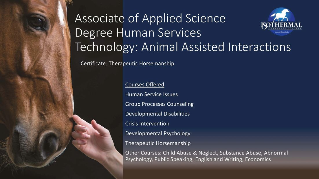 The Human Services Technology/Animal Assisted Interactions concentration prepares individuals for entry-level positions in service organizations providing animal interactions. The curriculum prepares students to incorporate specially selected animals in goal-directed interactions to facilitate change in people with mental and physical disabilities, social, emotional, and/or cognitive functioning.